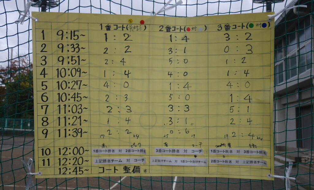 今回初めて取り入れた競技方式は、試合時間15分でノーアドバンテージ、コートチェンジは2ゲームごと、15分経過時点でラストポイントとしてゲーム数のみをカウントするというもの。9時に全員集合した後、くじびきで6つのカラーチームに分かれて対戦しました。