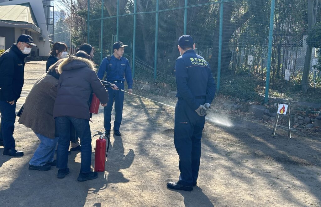 1月16日(金)、KSCCの各サークル代表者を対象に、クラブハウス横で恒例の消防訓練を実施しました。昨年度はダミーの消火器(消化薬剤の代わりに水)を貸し出していただいた自主訓練でしたが、今回は杉並消防署永福出張所から隊員の皆さまにお越しいただき、火災発生時の注意事項なども併せて教えていただきました。
